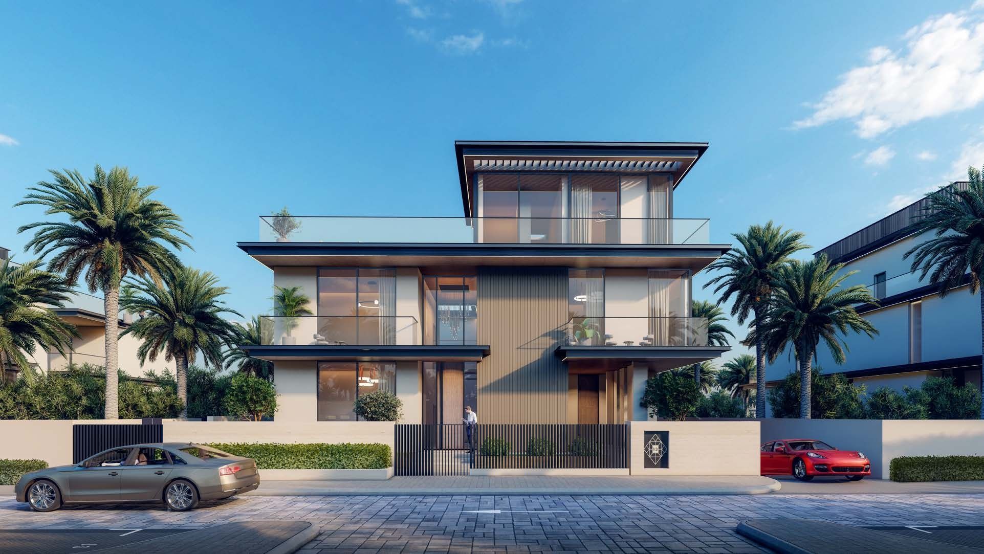 The villas at Nineteen Riviera Lagoon are distinguished by their two master bedrooms, each complete with walk-in wardrobes, en-suite bathrooms, and magnificent views from floor-to-ceiling windows. Lagoon-side living in this exclusive gated community of nineteen villas includes a community park with a children's play area, grand entrance, and Italian kitchens. The private second-floor entertainment space includes plunge pool access. Each property boasts large plot sizes and rooms for a chef, chauffeur, maids, and nanny. Additionally, modern amenities such as a car washing bay, in-house elevator, indoor green spaces, personalized interiors, and outdoor shower and washroom are included, all showcasing modern architecture. Also on the basement floor, there is parking accommodating from 7 to 12 cars per villa, and the complex provides additional parking for 35 vehicles.