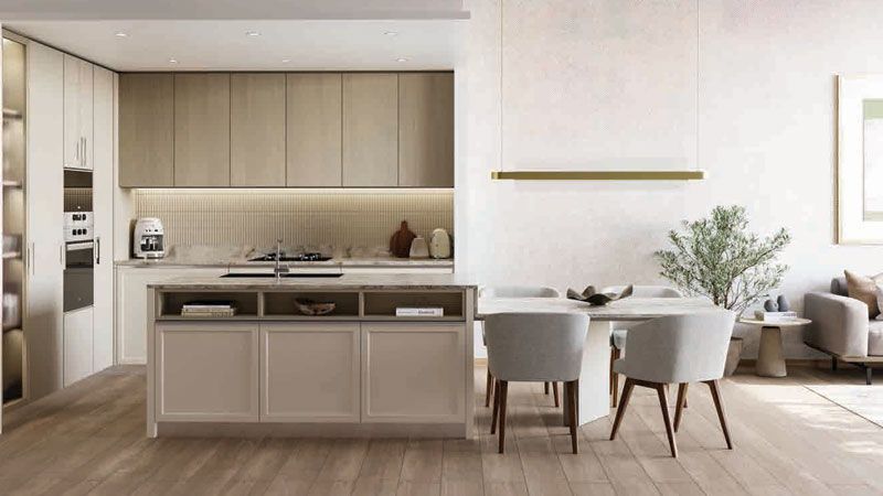 The kitchen at The Highbury is an open layout inspired by elegant details. The bright color palette brightens up the space giving it a sleek and modern touch, while the full-length cabinets made of light wood material; add warmth and depth to the overall design.