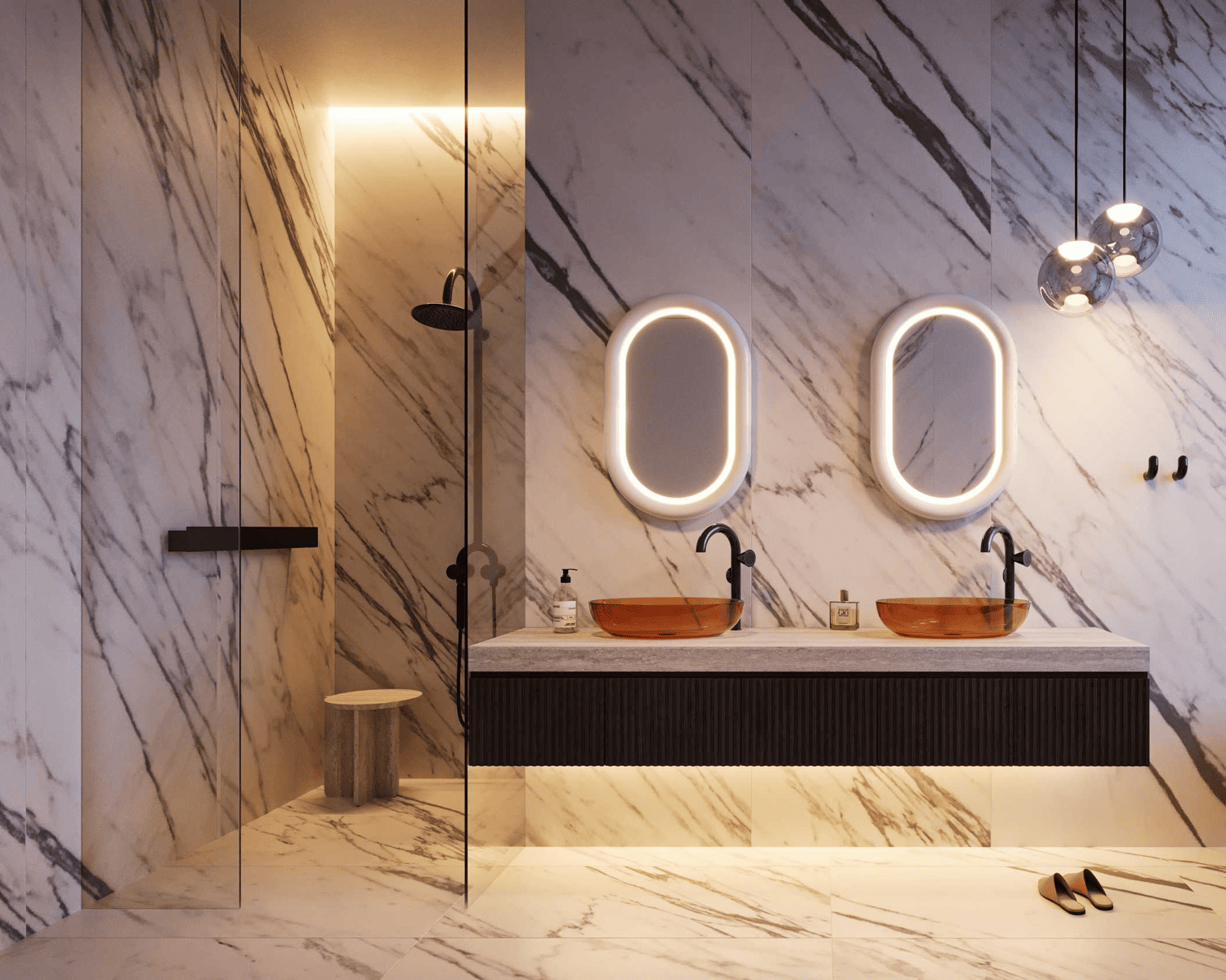 Modern finishing with high-quality materials, including italian silver travertine stone Romano and Calacatta Viola marble.