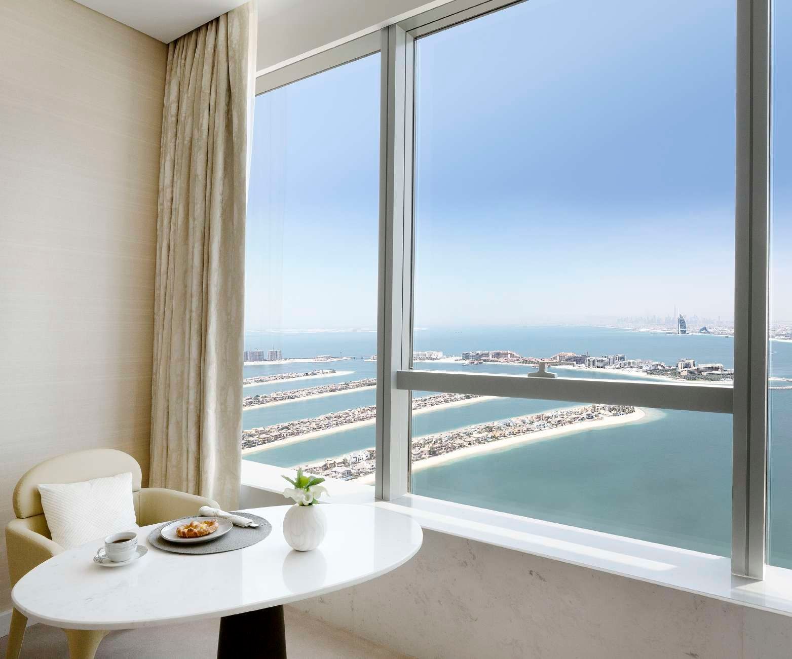 The iconic tower, inspired by the shape of a palm tree, features outstanding amenities including AURA Skypool and Lounge on the 50th floor with one of the world’s largest infinity pools; internationally-renowned SUSHISAMBA restaurant on the 51st floor and The View at The Palm, a public observation deck on the 52nd floor oering panoramic views of Palm Jumeirah, the Arabian Gulf and the Dubai skyline.