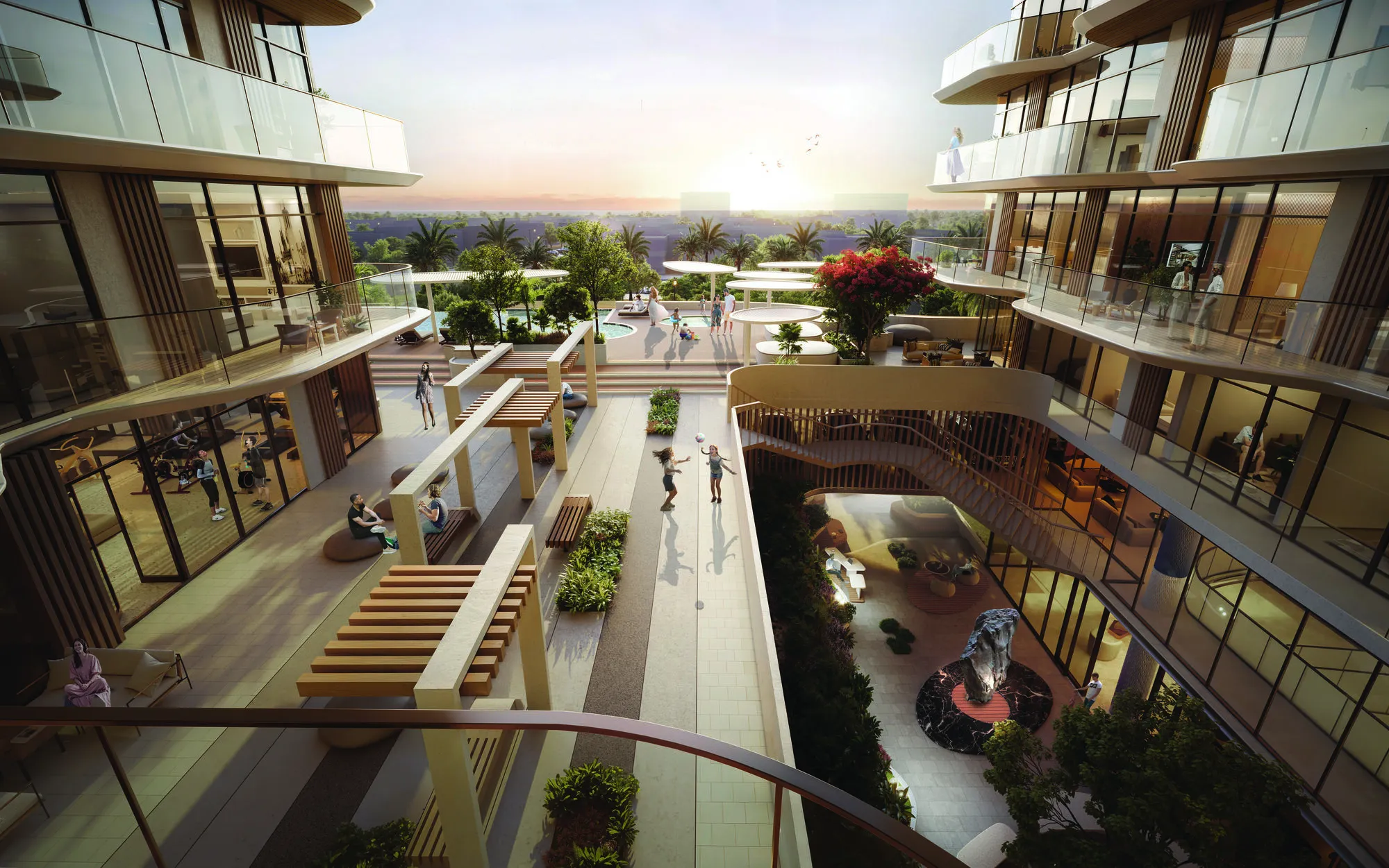 Life at Marquis Horizon is elevated through a carefully curated collection of amenities that nurture wellness, social interaction, and productivity. Residents enjoy a resort-inspired infinity pool, outdoor lounges, a fully equipped fitness gym, community hall, recreation room, rooftop yoga deck, amphitheatre, BBQ areas, and a padel court. Complemented by a central open-air courtyard, executive lounge, and wellness-focused spaces for work and movement, Marquis Horizon presents a lifestyle defined by comfort, connection, and a sense of calm in the heart of Dubai South.
