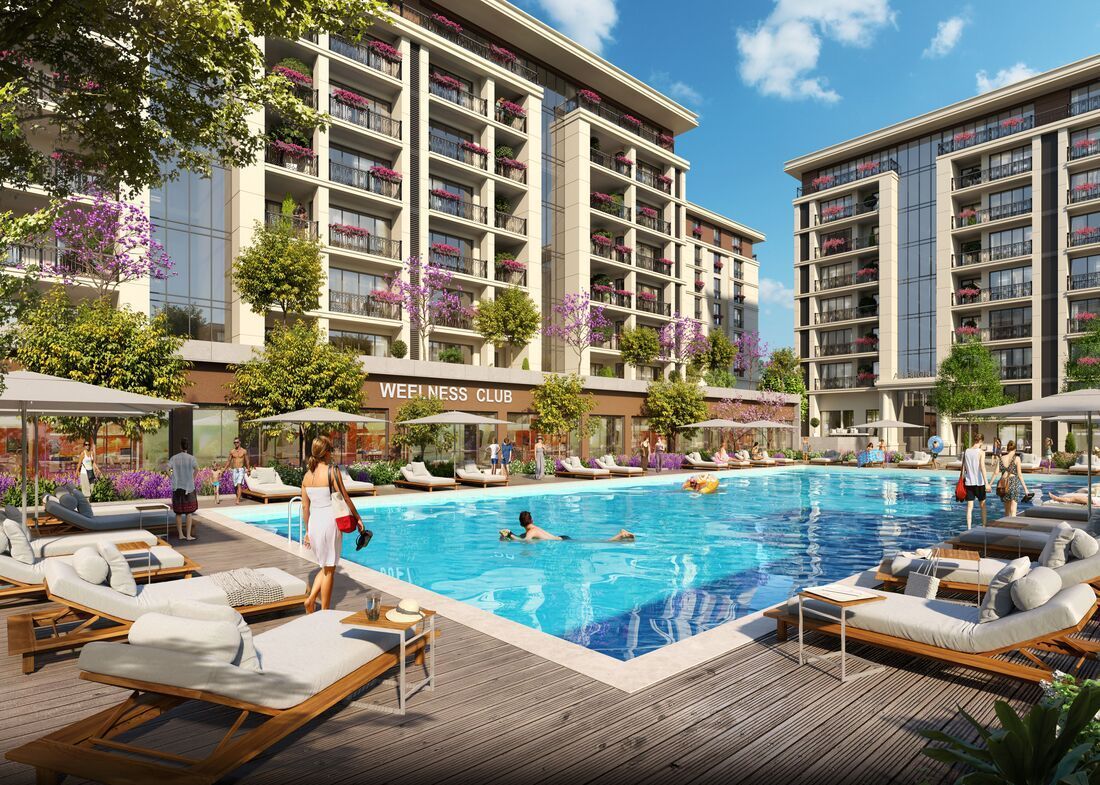 The social amenities include an outdoor swimming pool, two indoor pools, two fully equipped fitness centers, Turkish baths, saunas, a three-story closed parking area, children’s playgrounds, landscaped recreational zones, and security systems with intercom and 24/7 camera surveillance.