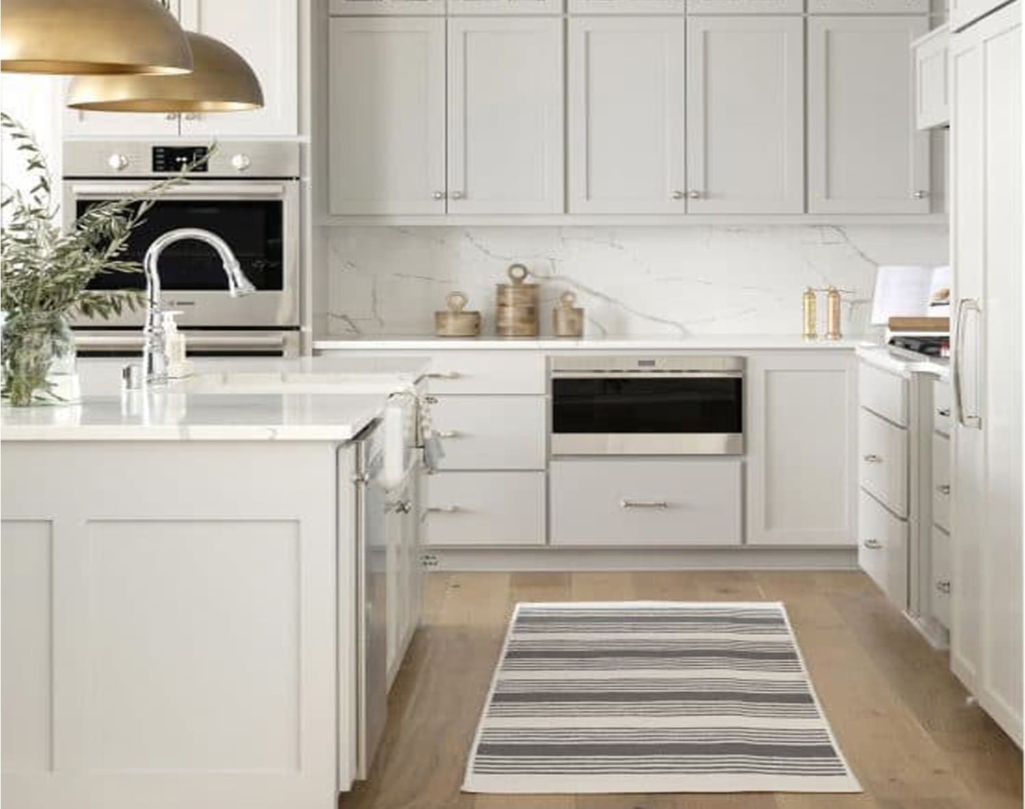 Kitchen with a suite and appliances (refrigerator, washing machine, microwave, stove)