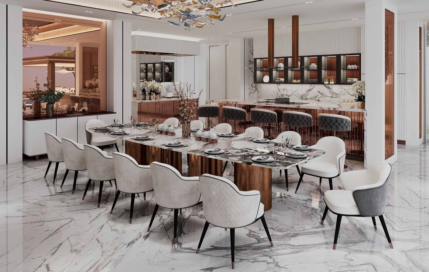 Completely finished using high quality materials. The soft elegance of statuario marble, hailing from the Carrara quarries in Italy, brings a touch of sophistication to Elaine, resulting in a timeless beauty throughout the villa