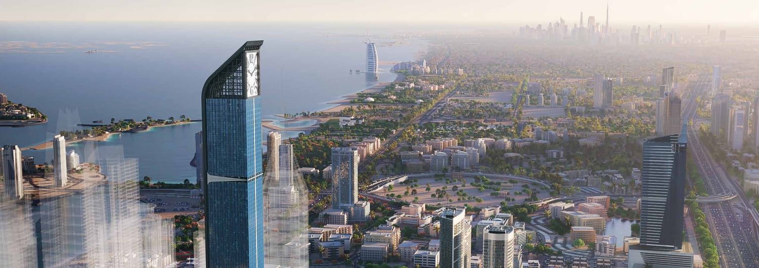 This architectural marvel comprising 106 floors will not only be the tallest branded residential tower boast the distinction of being the tallest residential clock tower globally. The angular structure at the tower's summit, adorned with a classic font and varying-sized numbers, promises to become an iconic feature on the Dubai skyline, offering breathtaking views, possibly overlooking the Palm Jumeirah.