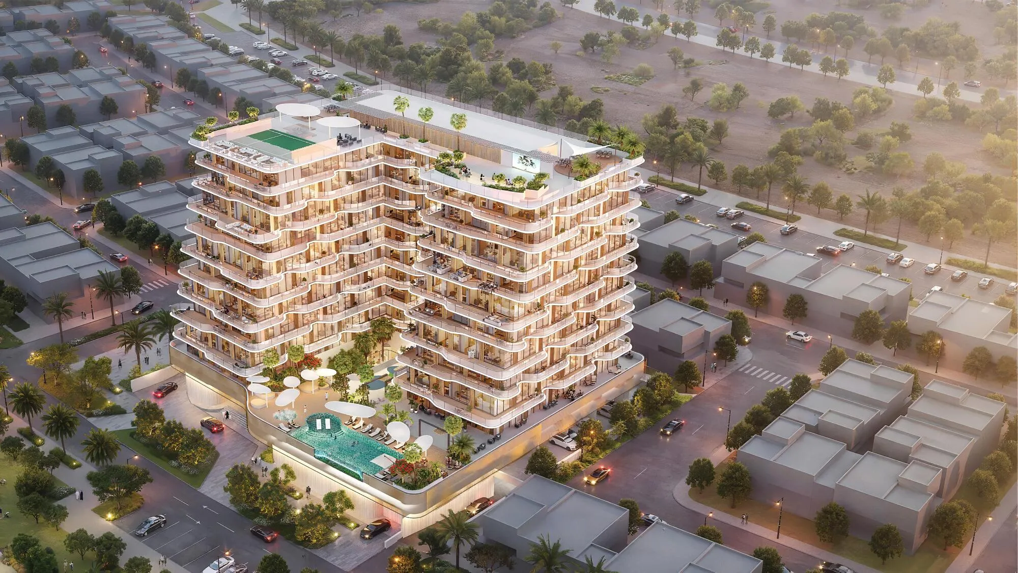 Marquis Horizon marks a defining residential address in Dubai South, conceived as a contemporary mid-rise community shaped by flowing architecture and understated elegance. Its distinctive wavy façade moves organically across levels, creating a sculpted form that responds naturally to light, airflow, and the surrounding environment. Designed as the flagship project of Marquis Developers in the district, the building embodies a vision of modern suburban living where balance, clarity, and long-term value take center stage.